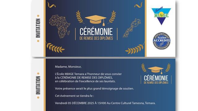 L’École MIAGE Temara a l’immense plaisir de convier ses partenaires, ainsi que les formateurs et les lauréats, à cette cérémonie annuelle, empreinte de joie et d’émotion, qui met en lumière :