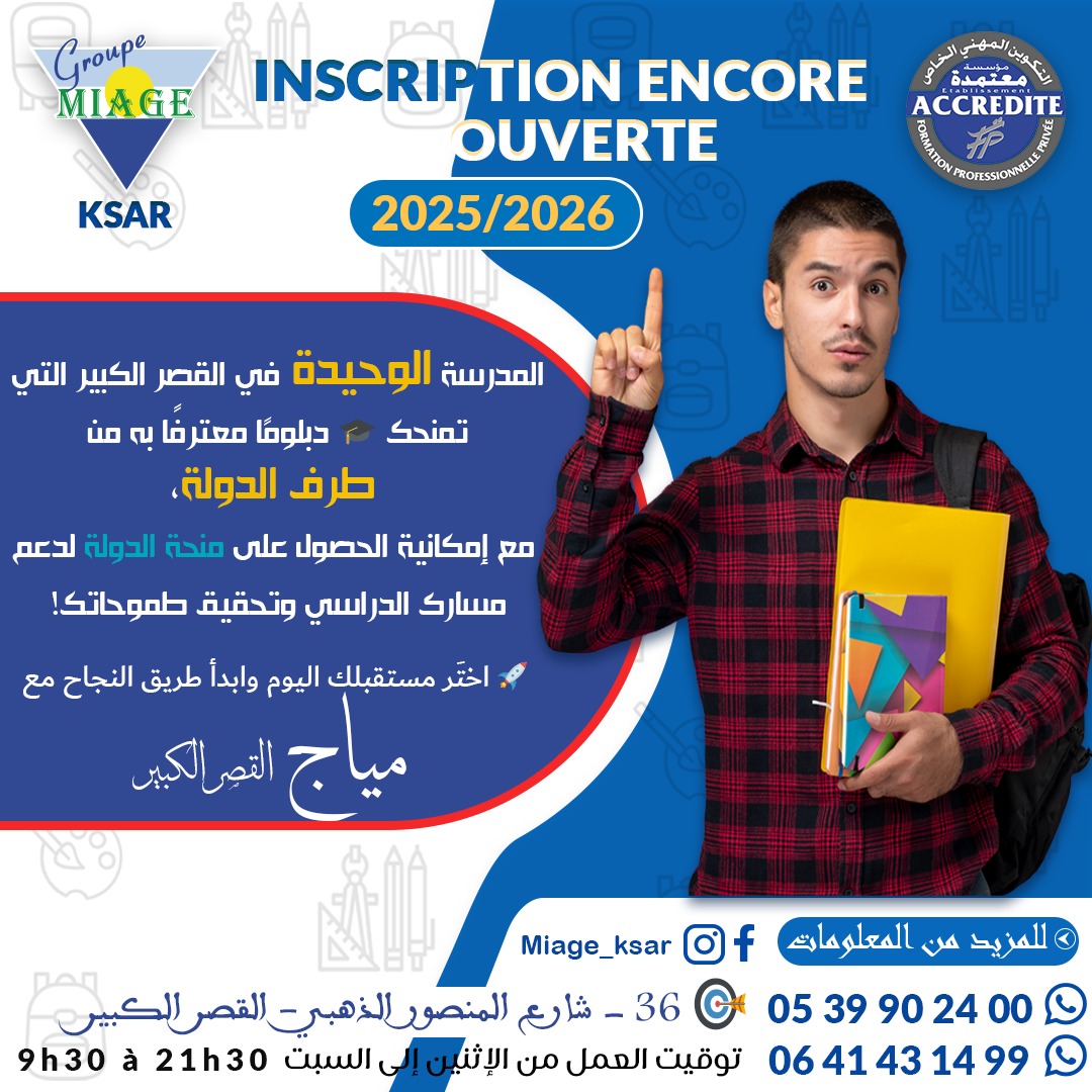 MIAGE Ksar EL Kébir école de formation Professionnelle Privée accréditée par l’état (Cycle Initial (Technicien et Technicien Spécialisé (Bac + 2) et Cycle Supérieur (Licence Professionnelle et Master Bac + 5)).