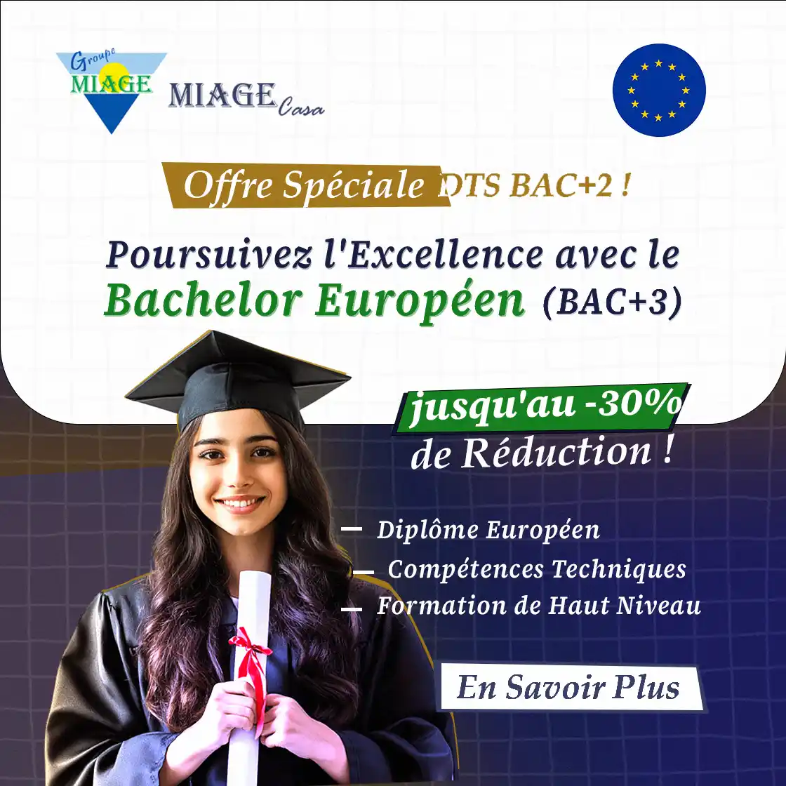 À cette occasion, MIAGE Casa offre à tous les lauréats DTS des Remises Importantes pour toute nouvelle inscription en Bachelor Européen (Bac+3) :